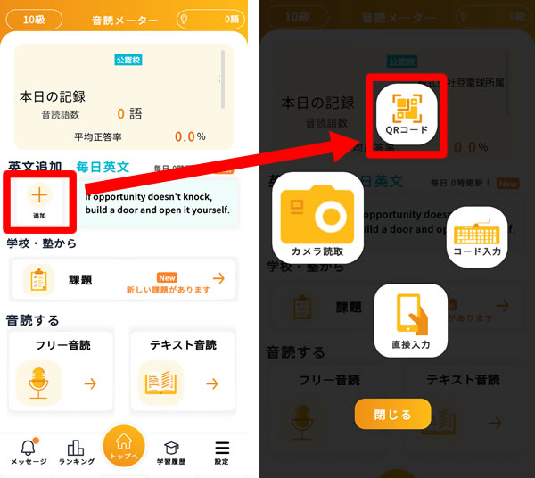 音読メーターで音読したい英文を登録できます。QRコードを発行してアプリで読み取れば、お好きな英文の音読練習ができます。